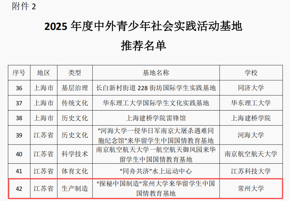 受教育部国际合作与交流司委托,中国教育国际交流协会近日公布了2025年度来华留学生“了解中国”优秀课程和中外青少年社会实践活动基地推荐名单,我校申报的“探秘中国制造”常州大学来华留学生中国国情教育基地成功入选,这是我校首次获此殊荣,成为全国124个中外青少年社会实践活动基地之一, 全省仅6所高校入选。
