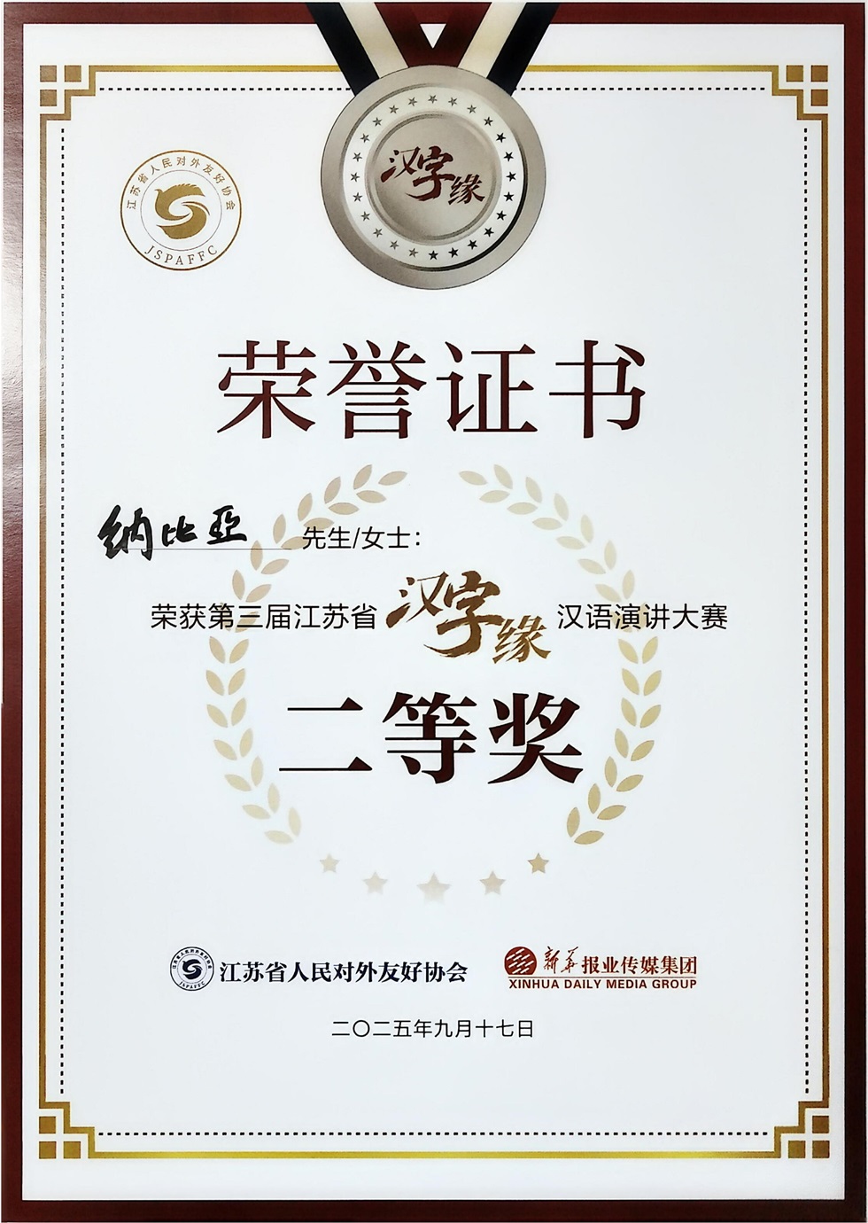 纳比亚同学以《不止进球!我眼中的“超越”力量》为题,讲述了她与“苏超”的故事。她表示,对语言和文化的浓厚兴趣,让她深深着迷于中国故事,未来希望继续留在中国,更深入地探索这里的文化底蕴,让这段“字缘”延续下去。她的演讲展现了我校留学生在汉语学习、文化适应和跨文化交流中的积极风貌,也彰显了我校在国际汉语教育和跨文化交际能力培养方面的扎实成效。